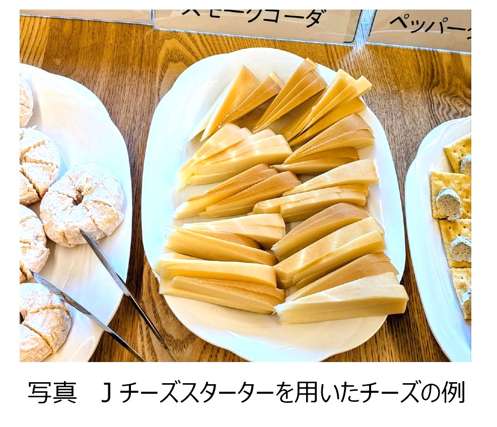 通常チーズ用スターターは、酸を生成してpHを下げる役割の乳酸菌と pHが下がった後にたんぱく質を分解することによりペプチドやアミノ酸を生成させる乳酸菌から構成されています。「Jチーズスターター」は主に後者の働きに関与する乳酸菌(アジャンクトスターター)です。これらJスターターを用いたチーズの試作を行い、チーズ作りに適した菌を絞り込みました。さらに、いくつかのチーズ工房に依頼して試作を繰り返しました。その結果、概ねJチーズスターターは好評で、中には非常に高い評価をした工房もあったということです。これらJチーズスターターは日本乳業技術協会から販売されます。