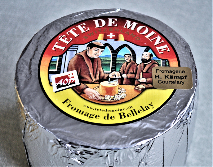 レマン湖が出たついでに、小型でハード系のスイス・チーズを紹介しましょう。スイス・チーズといえば、日本ではエメンタールを始め、大型のハード系のチーズがよく知られていますが、でも例外的にハード系ながら小さな円筒形のチーズもあります。ご存知、テット・ド・モワンヌ(Tête de Moine)です。このチーズはジロールという専用の器具で、カーネーションの花のように削りだしてサーヴィスすることで世界に知られるようになるのです。ここで、聡明な読者には「エーツ!このチーズは村の名前じゃなく修道士の頭って意味でしょ!」と叱られそうです。