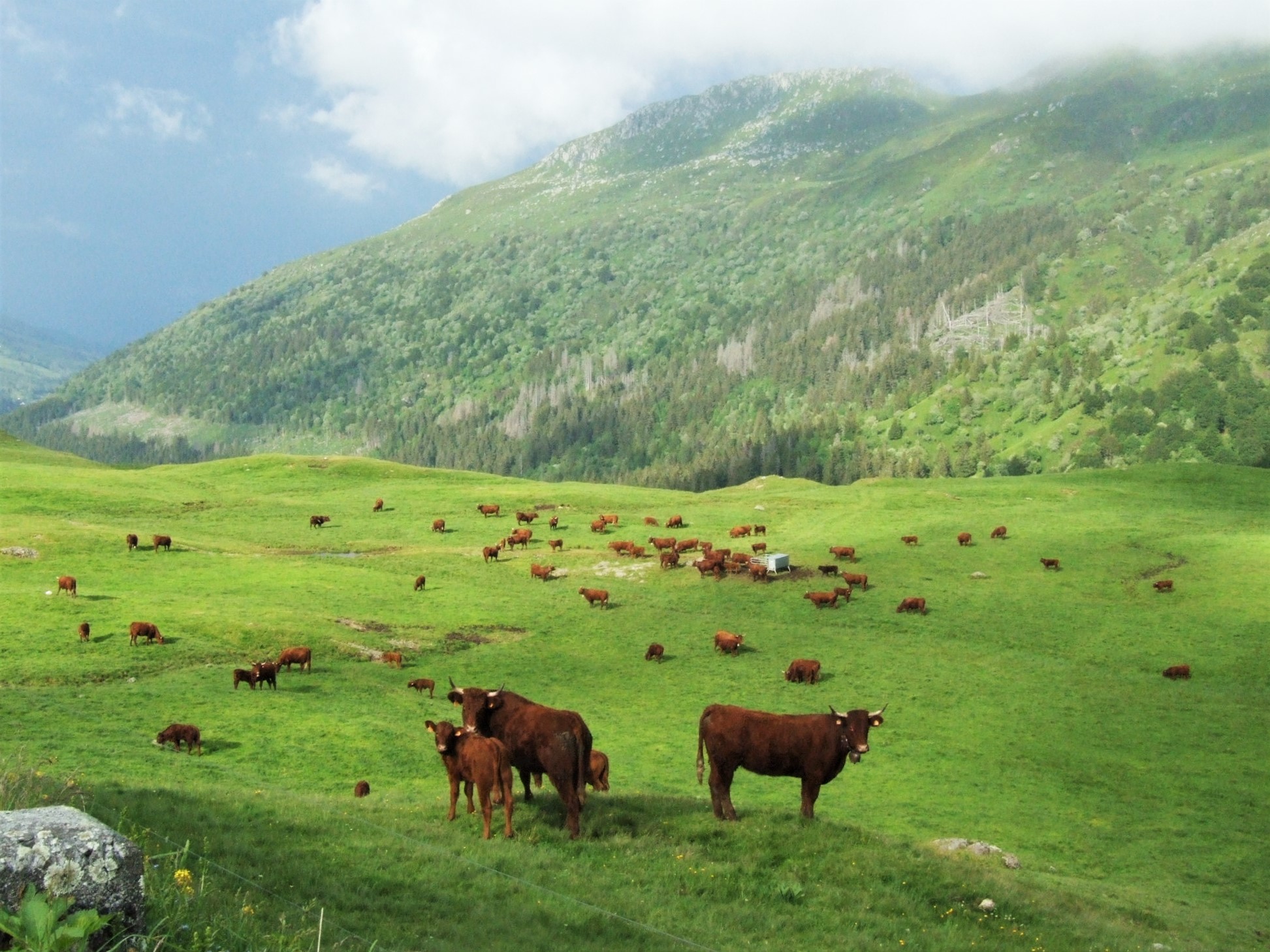 このあたりで造られるメインの大型チーズといえば、フランスで最も生産量の多いコンテ(Comté)だけれど、こんな話があります。コンテに限らず大型チーズを作ろうとすれば、どうしてもカード(乳を凝固させたもの)が残る。ぴったりとはいかないのです。だが、残ったカードを明日まで保存するには、ハエなどの害虫から守らなくてはならない。そこで、昔はチーズ釜の底に付着しているススをカードの上に塗って保存したというのです。そして、更に翌日に余ったカードをその上に載せて自家用のチーズを作った。それがモルビエというチーズの始まりという訳です。もちろん、今はなべ底のススなどを使わず、専用の木炭の粉を使っているというのですが、それが、このチーズの味を含めてどのような効果があるのか。残念ながらそうした記録に出会ったことはありません。