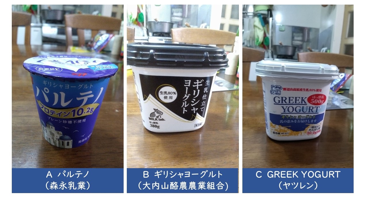 B ギリシャヨーグルト と C GREEK YOGURT は生乳を使い、これに粉乳を加えています。GREEK YOGURTは乳たんぱく質(多分カゼイン)も使っています。どの程度水切りをしているか分かりませんが、A パルテノに比べたんぱく質が少なく、カルシウムが多いことが特徴です。B ギリシャヨーグルトにはアテネ農業大学乳製品研究所に登録されているギリシャ伝統のサーモフィラス菌と独自菌を使って発酵させている旨が記載されています。そのせいか、酸味が強い印象でした。