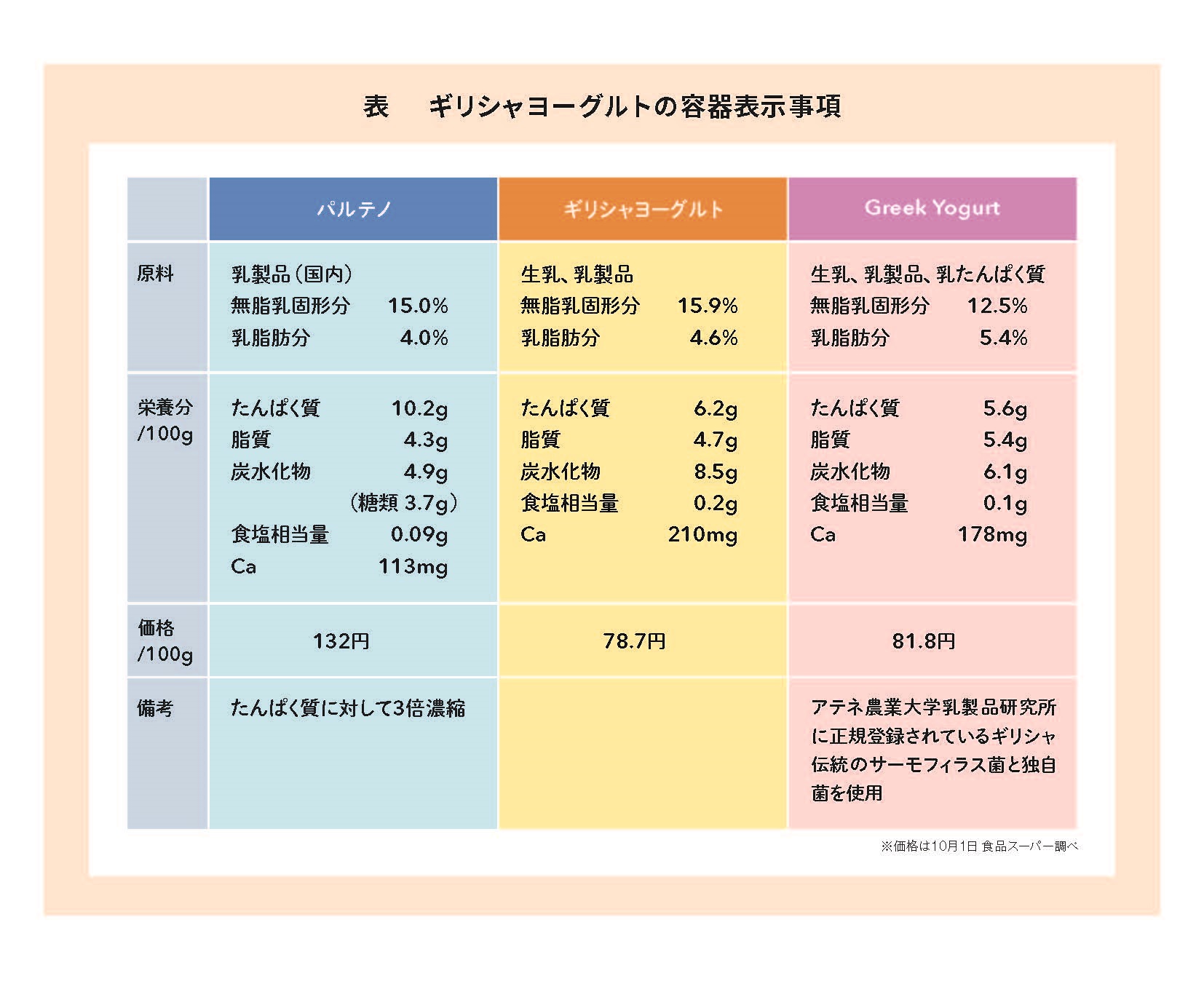 写真は近隣のスーパーにて買い集めたギリシャヨーグルトです。また、表は容器に記載されている分析値などです。栄養成分や価格は100g当たりの数値です。A パルテノはたんぱく質に対して3倍濃縮となっており、たんぱく質が約3倍で、他の成分は牛乳とほぼ同じです。また、原料として乳製品のみ記載されています。つまり原料は生乳ではなく、脱脂粉乳、全脂粉乳、クリームなどが使われています。このメーカーの代表的なプレーンヨーグルトでも原材料名には生乳とは書かれていません。粉乳を主原料にした方がしっかりとしたカードとなり、輸送中の振動によりカードが壊れるリスクを抑えることができるためです。