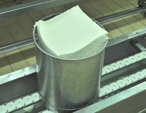 近代になると様々なチーズが輸入されるようになり、我々の生活に浸透していきますが、お馴染みのチーズもそのかたちを作る「型」はチーズの生産現場へ行かなければ見ることができません。そこでいくつかの「型」を写真でお見せしましょう。ソフトチーズの場合は底のないモールドをスノコにのせて脱水します。またパルミジャーノの様にスライドするフレームで締め付けて成形する方法も良く見られます。