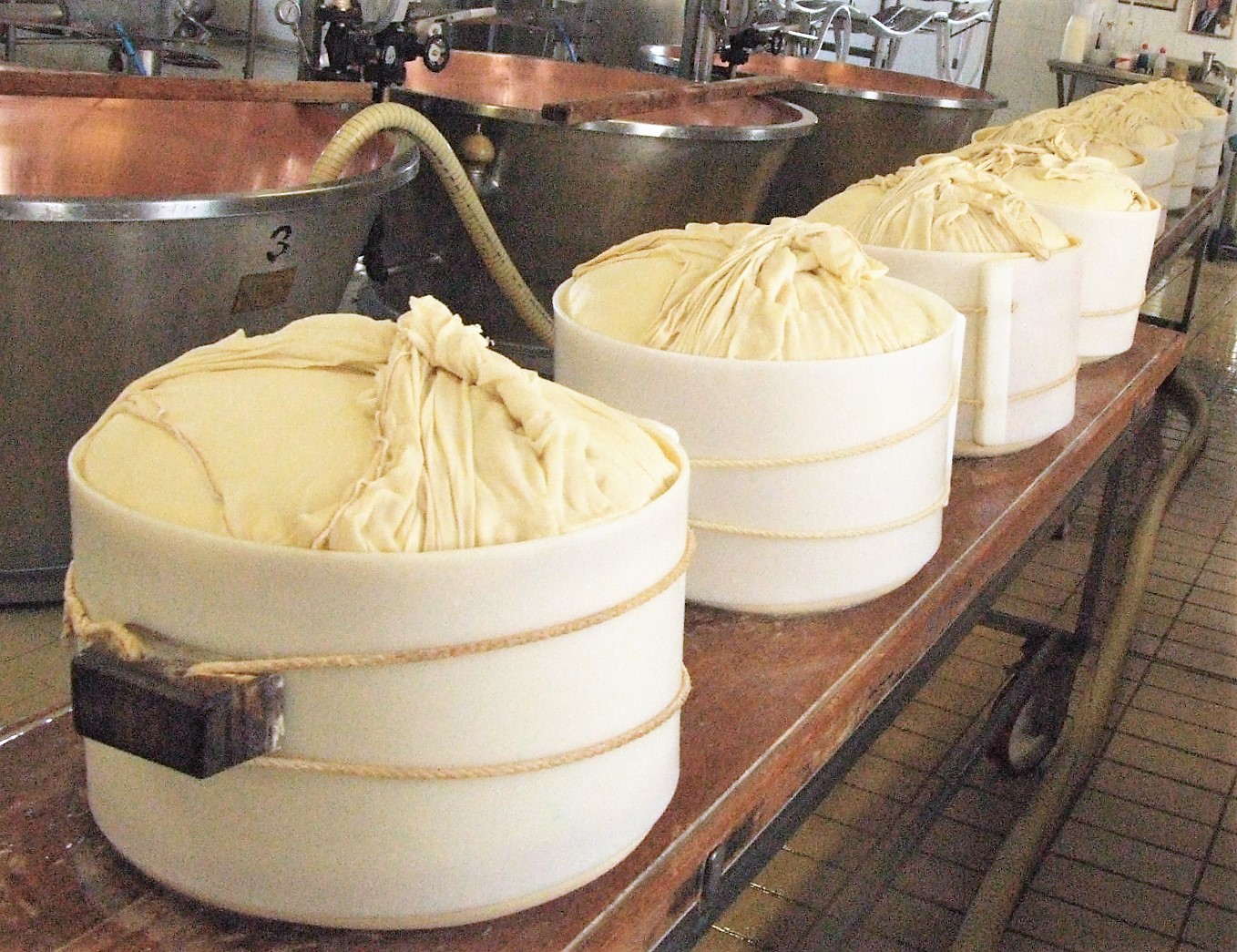このように、プレスの作業はカードの中の水分を絞り出すというイメージがありますが、そうではありません。ハード系のチーズの場合、この段階ではカードの塊には不要な水分はあまり残っていないのです。従ってこのプレスの目的は、カードを隙間なくしっかりと結着させそのチーズ本来の形を作るために行う作業なのです。例えば、最も硬いチーズのひとつであるパルミジャーノはプレスの工程はありません。このチーズはカードを細かくカットし攪拌しながら55℃まで加熱します。するとカードは水分を放出し硬く締まって弾力を増し、攪拌を止めるとチーズ釜の底に沈んで、しっかりとした固まりになります。