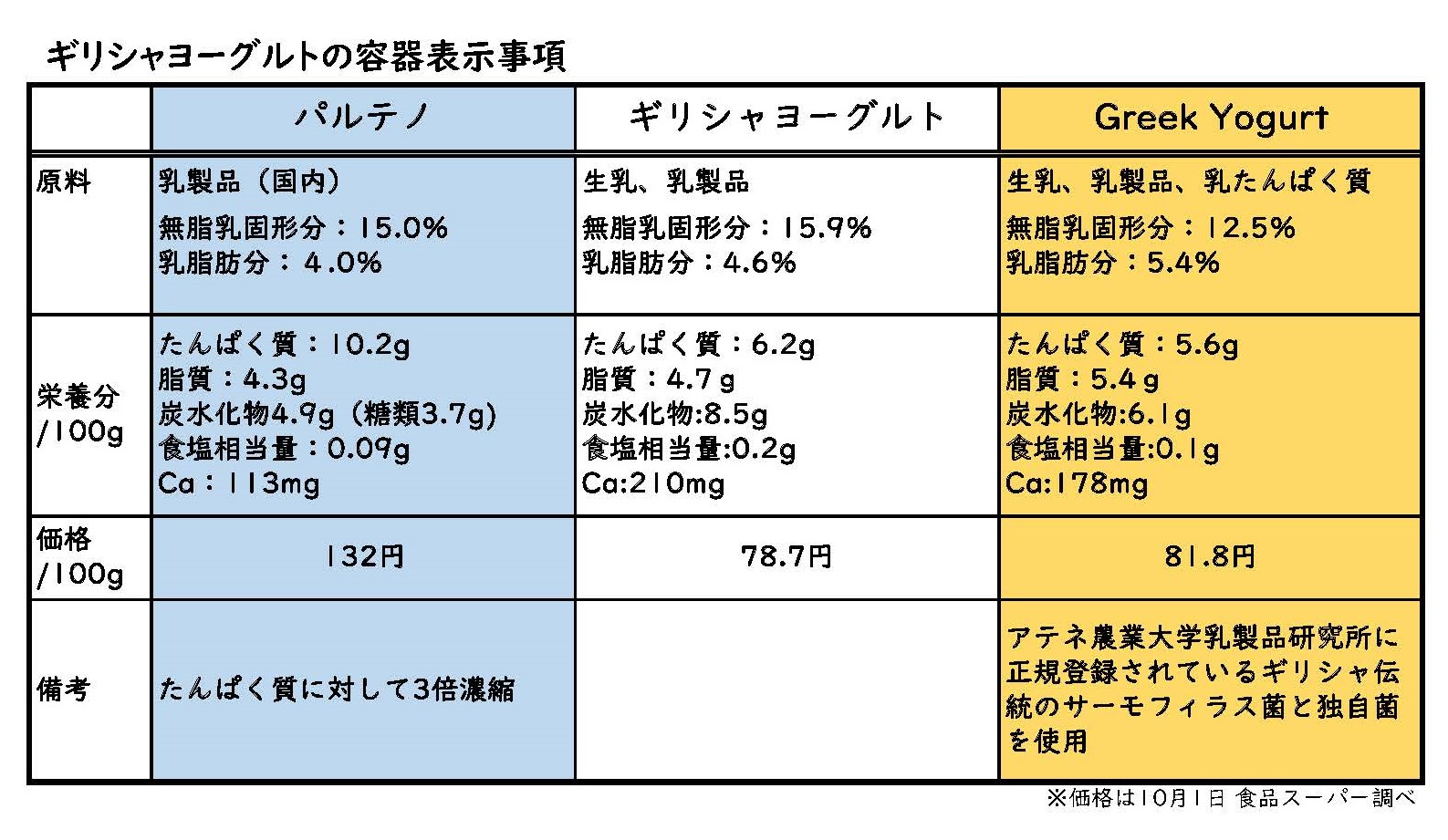 写真は近隣のスーパーにて買い集めたギリシャヨーグルトです。また、表は容器に記載されている分析値などです。栄養成分や価格は100g当たりの数値です。パルテノはたんぱく質に対して3倍濃縮となっており、たんぱく質が約3倍で、他の成分は牛乳とほぼ同じです。また、原料として乳製品のみ記載されています。つまり原料は生乳ではなく、脱脂粉乳、全脂粉乳、クリームなどが使われています。このメーカーの代表的なプレーンヨーグルトでも原材料名には生乳とは書かれていません。粉乳を主原料にした方がしっかりとしたカードとなり、輸送中の振動によりカードが壊れるリスクを抑えることができるためです。「ギリシャヨーグルト」と「GREEK YOGURT」は生乳を使い、これに粉乳を加えています。GREEK YOGURTは乳たんぱく質(多分カゼイン)も使っています。どの程度水切りをしているか分かりませんが、「パルテノ」に比べたんぱく質が少なく、カルシウムが多いことが特徴です。「ギリシャヨーグルト」にはアテネ農業大学乳製品研究所に登録されているギリシャ伝統のサーモフィラス菌と独自菌を使って発酵させている旨が記載されています。そのせいか、酸味が強い印象でした。